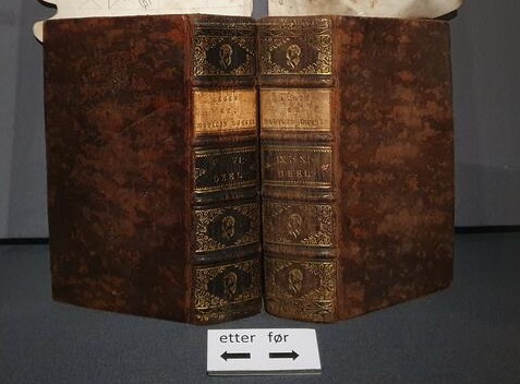 To bokomslag; en er svart og skitten, en er lys og tydelig gulltrykk. Lapper foran bøkene: «før», «etter»