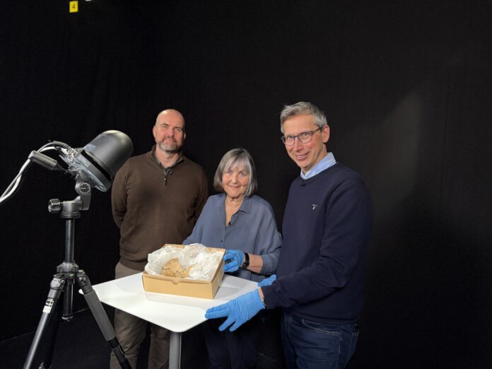 En kvinne i hvit labfrakk og med blå hansker går inn i en smal korridor med hyller på begge sider – et museumsmagasin. Hun klatrer opp en gardintrapp. Fra en hylle høyt oppe drar hun en skuff mot seg. Her ligger det flere gjenstander i små hvite esker. Hun tar ut en av dem, går ned stigen, mot oss og ut fra korridoren. Vi ser esken liggende på et bord. I esken ligger det en liten gjenstand i en pose av plast. Gjenstanden tas ut av posen, og vi ser det er en liten pilspiss med bitte små tagger langs kanten.