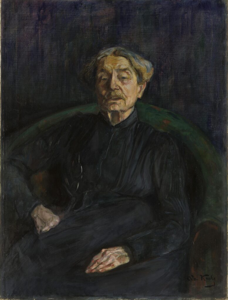 Vi går videre, stopper litt i kjoleavdelingen, før vi igjen bryter opplegget og går til avdelingen «Blant kunstnere». Her henger det et bilde av Hansteen malt av Oda Krohg. Vi får engasjert formidling, «dette praktfulle portrettet av den aldrende kvinnen». Vi står og ser på en kvinne som ser sint ut, «men hun gjør seg ikke til, hun er avslappet», sier omviseren og forteller så litt om teknikk. Omviseren blir faktisk sint, hun også, i hvert fall engasjert, når hun forteller om bildet rett ved siden av, Albertine av Christian Krohg. Hun vil at vi skal forestille oss livet i Christiania. En som står ved siden av meg, lar seg engasjere. Hun kom for Hansteen-omvisningen, men er fornøyd med erstatningen.