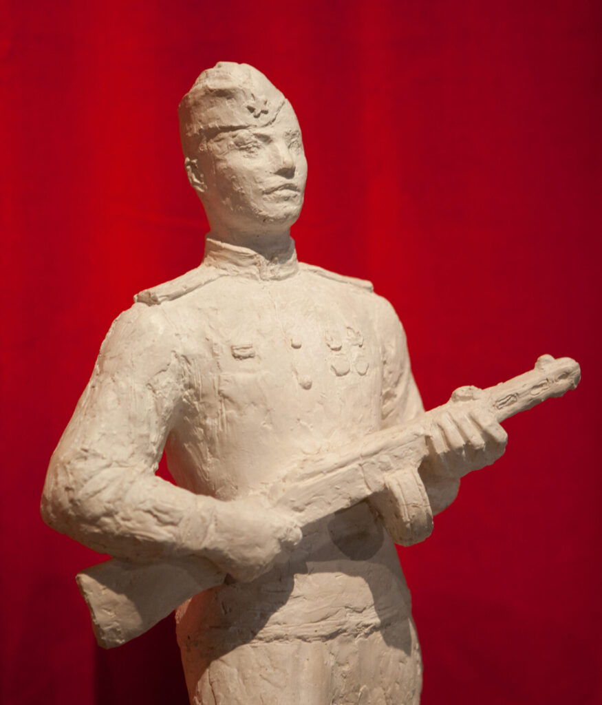 RUSSERMONUMENTET: Dette er originalmodellen til den to meter høye statuen «Den unge sovjet-soldat» som ble reist som et nasjonalt krigsminnesmerke i Kirkenes i 1952, for å hedre Den røde armés innsats i frigjøringen av Øst-Finnmark i 2. verdenskrig. Minnesmerket kalles Russermonumentet. Skulpturen er modellert av Stinius Fredriksen, og originalen står utstilt på Grenselandmuseet. Foto: Knut Åserud / Grenselandmuseet