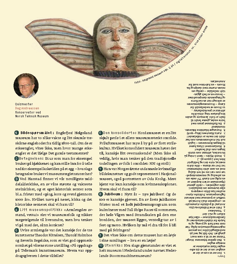 Det er tiden for å tenke mer på skismøring, utepils og båtpuss enn prosjektsøknader og utstillingsplaner – og å bytte ut lunsjen på jobb med påskeegg og appelsiner med familie og venner. Da kan en spørrekonkurranse (som vi sa for noen tiår siden) komme godt med. Aller helst med allment interessante spørsmål fra museumsfeltet.