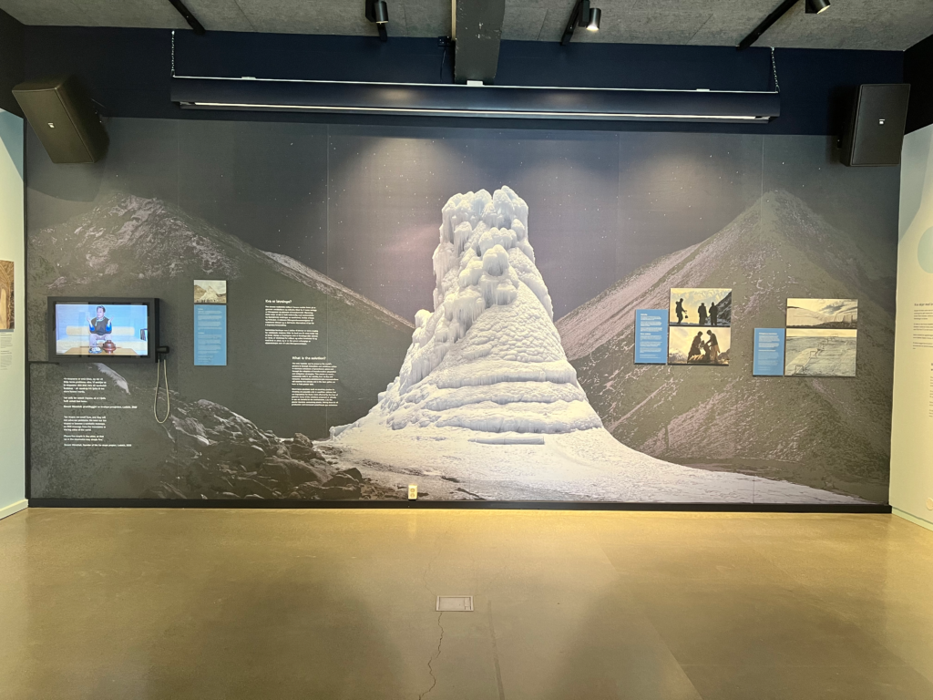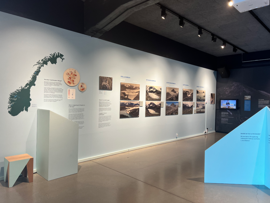 Ved sistnevnte inviteres publikum til å sette seg ned og tre inn i istunnelen ved Klimaparken 2469. Dette er et spennende innslag. Jeg skulle gjerne sett flere elementer i utstillingen som bidro til variasjon i formidlingen. Det kunne gjerne vært noen relevante gjenstander, for eksempel utstyr som brukes til breforskning, eller noe annet. Jeg syns uttrykket blir litt tungt og traust når det hovedsakelig er tekst, diagrammer og bilder på veggene.