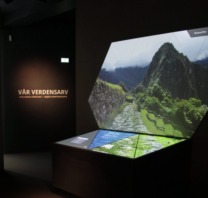 Det første som slår meg idet jeg går inn i utstillingen, er at her er det mange lysende skjermer. På flere av dem rullerer det bilder og videoer av severdige verdensarvsteder, både norske og utenlandske. Samtlige er vakre blikkfang som understreker de utvalgte stedenes estetiske særegenhet. Disse skaper stemning i rommet og fungerer som passende rammer. En fordel med skjermene er at de inneholder mye spennende informasjon, som publikum kan bla seg gjennom og utforske etter ønske og interesse. Flere steder er det for eksempel quiz med spørsmål man kan bryne seg på.