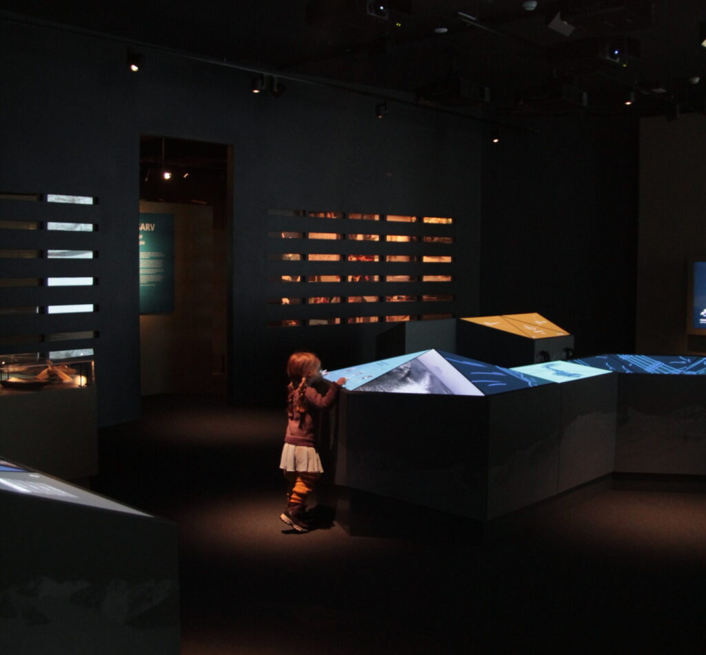 Et annet blikkfang er det stilige bordet i midten av utstillingen, hvor de åtte norske verdensarvstedene presenteres. Med bilder og informasjon formidles stedenes bakgrunn og betydning, med begrunnelser om hvorfor de har oppnådd status som verdensarv. Dette er lærerikt og interessant. Det jeg liker mindre med bordet er at når man blar seg gjennom de ulike stedene, fordeler bildene og informasjonen seg bortover på flere skjermer. Jeg syns at dette blir litt rotete, upraktisk og mindre leservennlig. Men visuelt fungerer det fint.