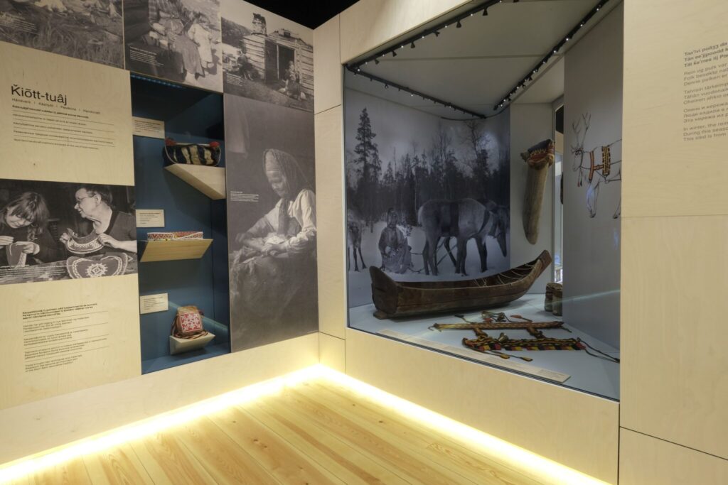 Basisutstillinga til museet, Saaʹmijânnam Skoltelandet, er konsentrert rundt ein stor installasjon laga av kryssfiner. Det bidreg til eit heilskapleg og behageleg visuelt inntrykk.
