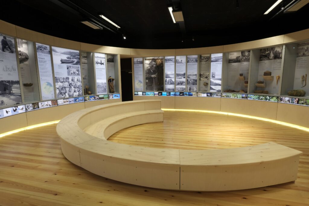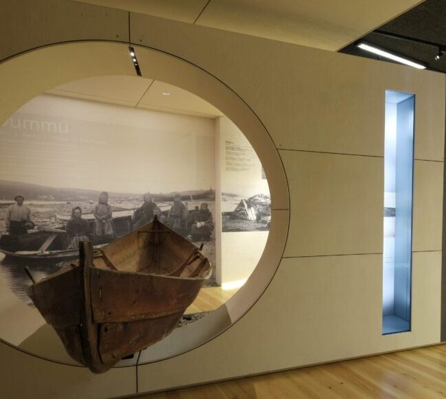 Gjenstandane i utstillinga er plassert i plassbygde montere i finerinstallasjonen og bak glas. Unntaket er den tradisjonelle båten brukt til kastenotfisket i Skoltefossen like ved museet. Den er plassert på tvers gjennom eit rundt ope slags vindauge i kryssfineren på høgre hand med ein gong me kjem inn i utstillinga. Slik kan båten betraktast frå ulike vinklar, og gjennom vindauget får me eit lite glimt av kva som venter på andre sida når ein beveger som gjennom utstillinga.